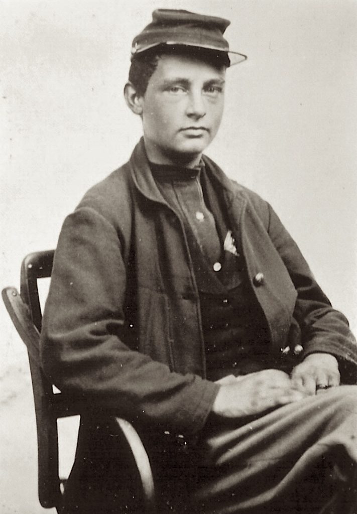 FOSTER, MERRILL T. (1848-1932). Corporal, 1st Vermont Light Artillery. A native of Montpelier, Vermont, and a resident of Moretown, Vermont, Foster, at the tender age of 14 (according to both his family and Green-Wood records), enlisted as a private on January 2, 1862, and mustered into the 1st Vermont Light Artillery on February 18 (though the minimum age of enlistment during the Civil War was 18). He was promoted to corporal on February 1, 1864, and mustered out on August 10, 1864, at Brattleboro, Vermont. He applied for and received an invalid pension in 1896, certificate 824325; the pension was updated in 1911.