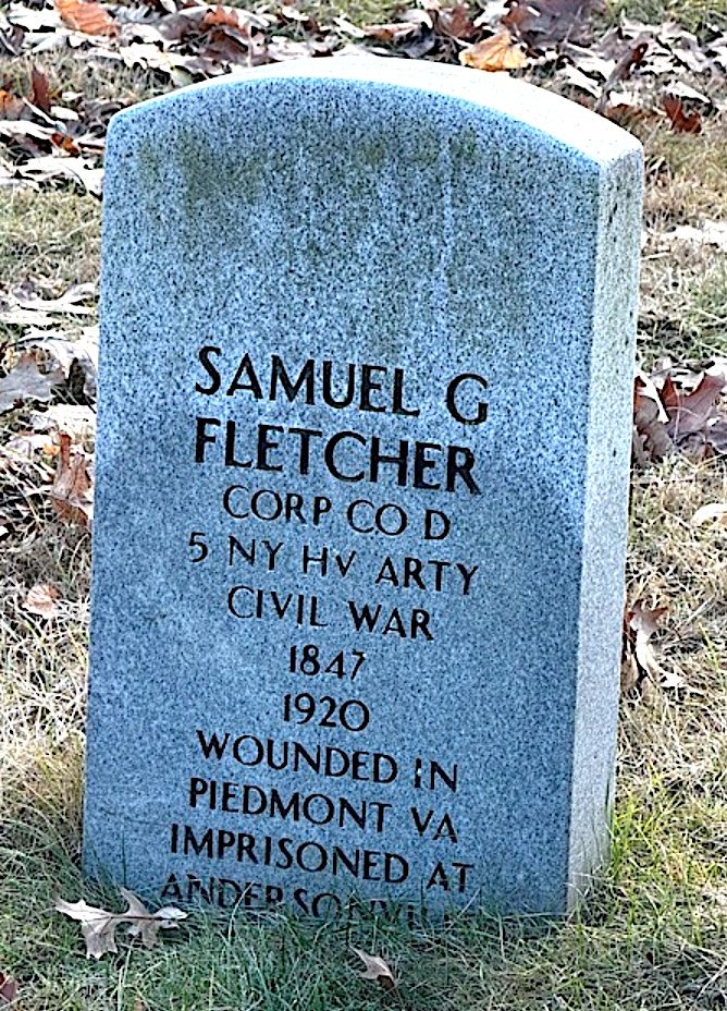 FLETCHER, SAMUEL GEORGE (1847-1920). Corporal, 5th New York Heavy Artillery, Company D. Fletcher, who was 5’10” with a fair complexion, enlisted at Brooklyn as a private on February 18, 1862, and mustered into the 5th Heavy Artillery that same day. According to a descendant, his brother, James C. Fletcher (see), also served in the 5th Heavy Artillery. He re-enlisted on February 18, 1864, and was paid a $100 bounty as a veteran volunteer. After being shot in the face at Piedmont, Virginia, on June 5, 1864, (the ball never being removed), he lay on the battlefield for three days. He was captured on June 10, 1864, while hospitalized in Staunton, Virginia, and imprisoned at Andersonville, Georgia, in early July of that year. During his incarceration, Fletcher recalled having no rations for three days that August. After being transferred to Camp Lawton Prison in Millen, Georgia, on November 11, 1864, he was exchanged on December 10 at Florence, South Carolina, and rejoined the Union lines five days later at Camp Parole, Annapolis, Maryland. At that time, he weighed only 96 pounds. After he was promoted to corporal on March 20, 1865, he rejoined his unit in May and mustered out at Harpers Ferry, West Virginia, on July 19, 1865.