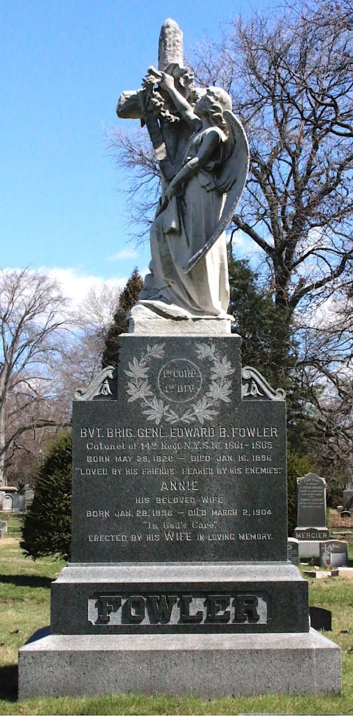 He was an accountant, United States Customs official, and bank officer after the Civil War. In 1871, he was elected president of the 14th Veterans’ Association. The association wrote a letter of support that was signed by Albert G. A. Harnickell (see) when he was a candidate for sheriff of Kings County in 1878, “…We, his comrades in the trial by fire, his associates in private life, and his co-laborers in political action, make this claim in his behalf, asserting that General Fowler’s standing as a Republican, and his services to the party, make him the peer of any other Republican who may be named for the office of Sheriff, while his services in the Army of the Union entitle him to a preference…” He lived at 47 Brevoort Place in Brooklyn at the time of his death.