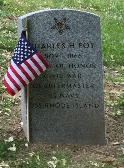 He was awarded a Medal of Honor on June 22, 1865, for his action at Fort Fisher and Federal Point Batteries, North Carolina, on January 13-15, 1865. At that time, Foy carried out his duties courageously on-board the Rhode Island and “…continued to be outstanding by his good conduct and faithful services throughout the engagement, which resulted in a heavy casualty list when an attempt was made to storm Fort Fisher.” That special compliment to Foy was also included in the report of Commander Stephen D. Trenchard of the Rhode Island in his report of that action on January 16, 1865. Trenchard also noted that Foy had been in the Navy upward of twenty years, three of which were on the USS Rhode Island. He died from an aneurysm at the Brooklyn Naval Hospital on May 30, 1866, while still a seaman. Section 10, lot 13324.
