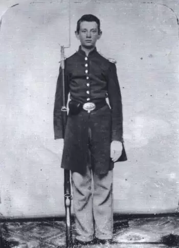 FOSTER, MERRILL T. (1848-1932). Corporal, 1st Vermont Light Artillery. A native of Montpelier, Vermont, and a resident of Moretown, Vermont, Foster, at the tender age of 14 (according to both his family and Green-Wood records), enlisted as a private on January 2, 1862, and mustered into the 1st Vermont Light Artillery on February 18 (though the minimum age of enlistment during the Civil War was 18). He was promoted to corporal on February 1, 1864, and mustered out on August 10, 1864, at Brattleboro, Vermont. He applied for and received an invalid pension in 1896, certificate 824325; the pension was updated in 1911.