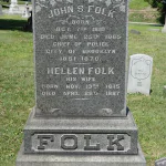 After the Civil War, the Board of Commissioners appointed Folk inspector for the Metropolitan Police Department with authority for the entire Brooklyn police force. He lost that position when the Brooklyn Board of Commissioners was formed in 1870. He was made an inspector in 1872 and superintendent a year later. Upon his death, a committee of New York Police Department captains was formed to arrange his funeral. His son, William H. Folk (see), was captain of the 12th Precinct in Brooklyn. He last lived at 170 Skillman Street in Brooklyn. He died from nephritis. Section 55, lot 14206.