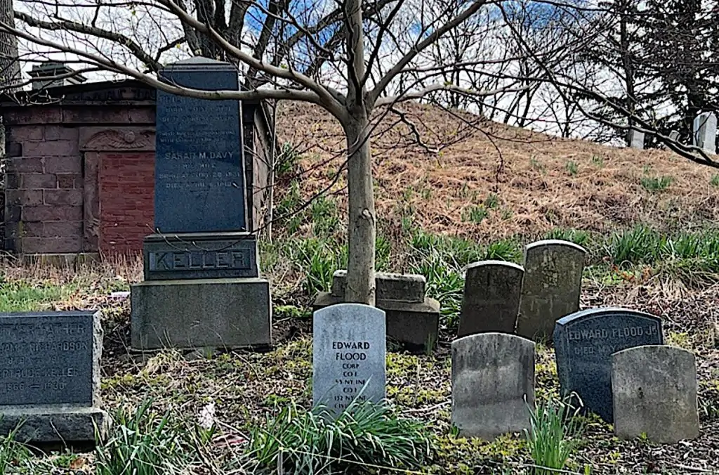 The censuses of 1870 and 1880 list his occupation as watchman. The Veterans Schedule of 1890 confirms his Civil War service. Flood last lived at 102 Prince Street in Brooklyn. Enteritis caused his death. In 1891, his widow, Mary Flood, applied for and received a pension, certificate 305,168. Section 109, lot 45.