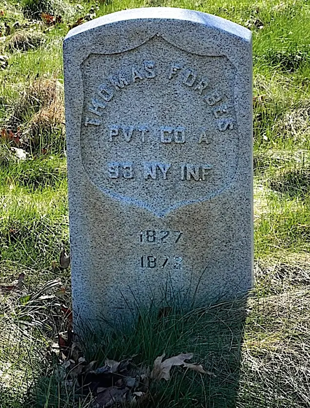 According to the census of 1870, Forker was a clerk for the Brooklyn Bridge Company; he was a bookkeeper according to the census of 1880. In 1892, he sought an invalid pension, application 1,126,500, but there is no certificate number. When his wife Sarah, who is interred with him, died in 1905, her obituary in the Brooklyn Standard Union reported that he was a retired contractor. Forker’s last residence was 693 Degraw Street in Brooklyn. He died of a cerebral hemorrhage. Section 53, lot 6332.