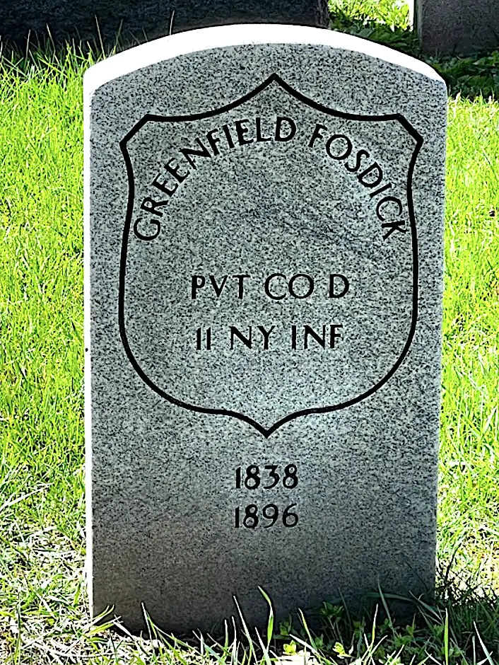 FOSDICK, GREENFIELD (1838-1896). Private, 11th New York Infantry, Company D. Fosdick, who was born in New York, enlisted as a private on April 20, 1861, at New York City, and mustered into the 11th New York on May 7. After he was wounded in the right ankle on July 21, 1861, at Bull Run, Virginia, he became a prisoner of war for nearly five months. He mustered out on June 2, 1862, at New York City. In 1872, his application for an invalid pension was granted, certificate 512,283.