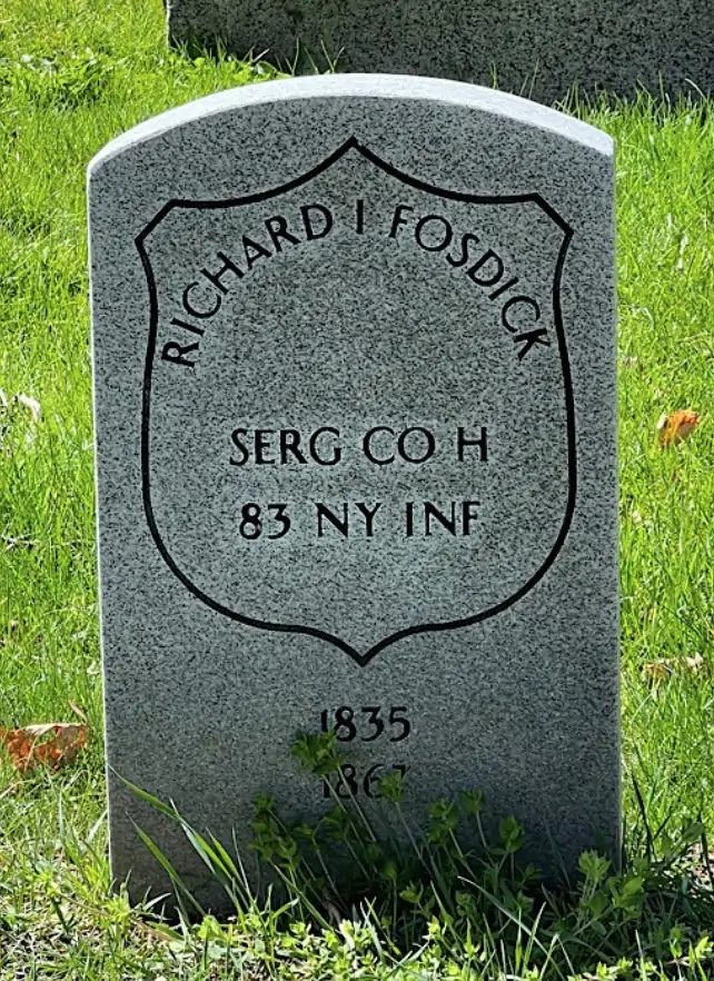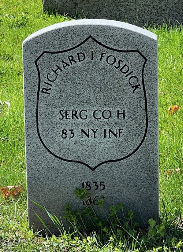 FOSDICK, RICHARD INMAN (1835-1867). Sergeant, 83rd New York Infantry, Company H. Born in New York City and a painter according to the census of 1860, Fosdick enlisted there as a corporal on May 27, 1861, and immediately mustered into the 83rd New York. He was promoted to sergeant on October 3 of that year, and was discharged for disability on February 11, 1863, at Convalescent Camp. He was the brother of Greenfield Fosdick (see). As per his obituary in the New York Herald, he was a Freemason; his fellow Masons were invited to attend his funeral. He last lived at 328 West 15th Street in Manhattan. He succumbed to heart disease. In 1872, Cornelia Fosdick applied for and received a widow’s pension, certificate 171,042. Section 14, lot 12666.