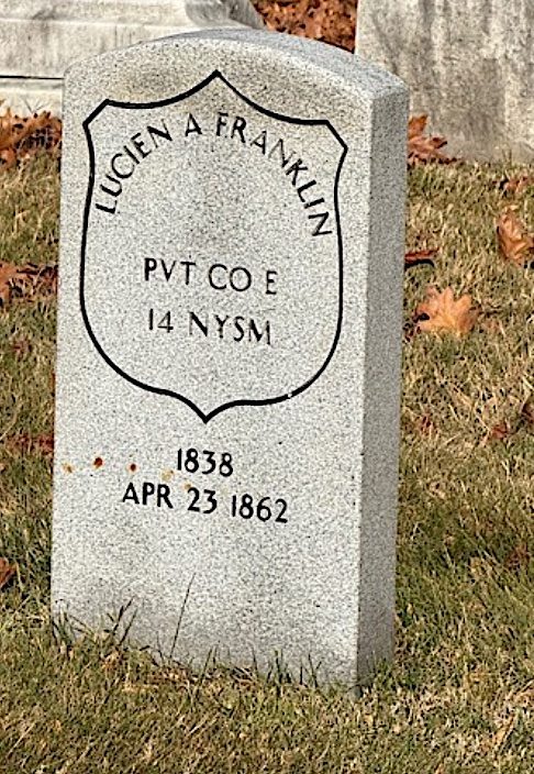 FRANKLIN, LUCIEN A. (or L. A.) (1838-1862). Private, 84th New York (14th Brooklyn) Infantry, Company E. A native of Brooklyn, Franklin enlisted on April 18, 1861, mustered in on May 23, and was discharged for disability on July 24, 1861, at Arlington, Virginia. He died of consumption on April 23, 1862. As per his obituary in The New York Times, his comrades in the Fourteenth Regiment were invited to attend his funeral. His mother, Ann Franklin, who is interred with him, applied for a pension in January 1891, application 502,017, but she died before it was certified. Section 147, lot 22232.