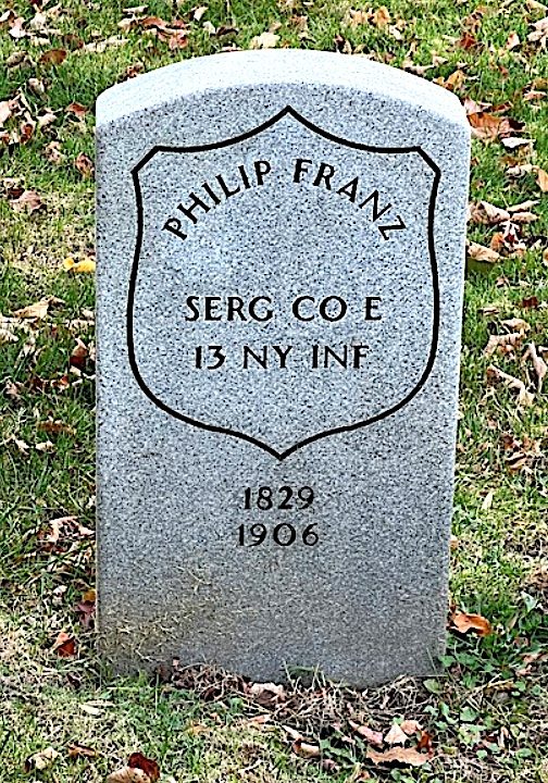 FRANZ, PHILIP (1829-1906). Sergeant, 13th Regiment, New York State Militia, Company E. A New Yorker by birth, he was a baker according to the 1860 census. Franz served with the 13th Regiment as a sergeant for three months in 1861. He then re-enlisted at Brooklyn on May 28, 1862, returned to the 13th Regiment’s Company E, and mustered out on September 12, 1862, at Brooklyn. As per the census of 1870 and the Brooklyn Directory of 1873, he was in the hay and feed business; the census of 1880 and the Brooklyn Directory of 1881 indicate that he was a painter. His Civil War service is confirmed by the Veterans Census of 1890. In 1891, his application for an invalid pension was approved, certificate 991,195. The census of 1900 reports that he was a house painter; the Brooklyn Directory for 1901 states that he was a baker. A member of William Rankin Post #10 of the G.A.R. from 1894 to 1906, he was also a Freemason; comrades from both associations were invited to attend his funeral.