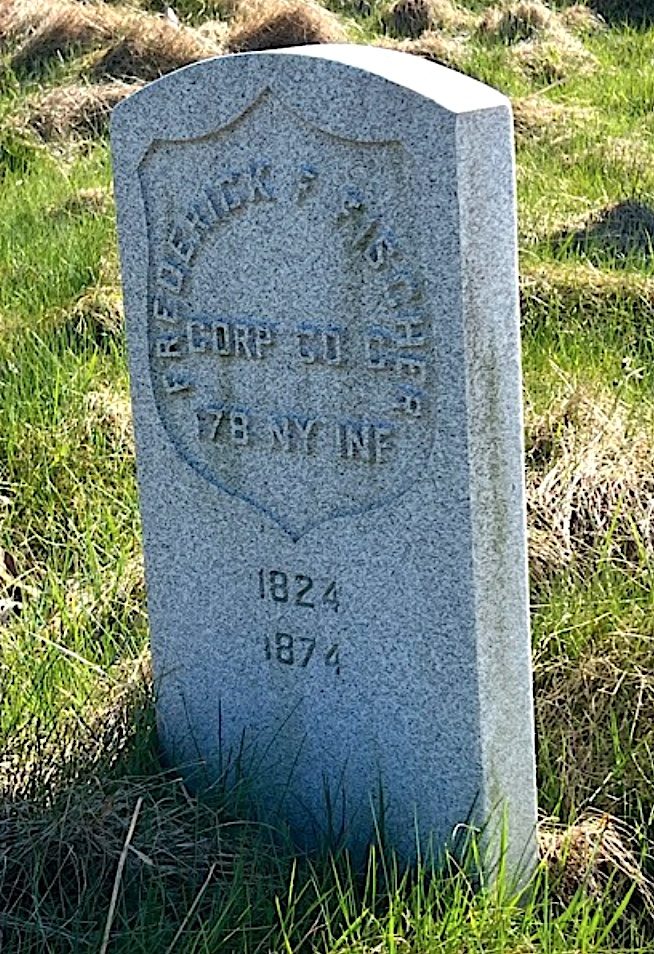 FISCHER, FREDERICK F. (1824-1874). Captain, 178th New York Infantry, Companies I and C; sergeant, 29th New York Infantry, Company E. Fischer, who was born in Germany, was a tailor according to the 1860 census. During the Civil War, he enlisted as a private at New York City in 1862, mustered into the 29th and at muster out, achieved the rank of sergeant. As per his muster roll, he was 5′ 8″ tall with gray eyes, brown hair and a light complexion. On August 31, 1863, he re-enlisted as a private at New York City, mustered into Company I of the 178th New York on September 3, and was promoted to corporal on October 1. On February 1, 1865, he transferred into Company C and was discharged from military service on April 20, 1866, at Montgomery, Alabama. According to the National Park Service website, he left the 178th as a captain; it is unclear when he was promoted to that rank. The New York City Directory of 1868 and the census of 1870 indicate that he was a tailor. His last residence was 103 Delancey Street in Manhattan. He died from typhoid fever. Section 17, lot 17245, grave 1823.