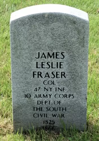 FRASER, JAMES LESLIE (1825-1866). Colonel, 47th New York Infantry. Born in Ireland, James Leslie Fraser enlisted for three years on May 16, 1861, mustered into the 47th New York Infantry as its lieutenant colonel with rank from September 14, and officially commissioned on December 4. He was promoted to colonel on September 3, 1862, with rank from August 5, 1862. Fraser served with the 10th Army Corps, Department of the South, at Hilton Head, South Carolina, in October 1862, when he was appointed port commandant for Port Royal, and was discharged for disability six months later, suffering from liver problems and diabetes. Following the War, Fraser owned a restaurant in New York City. He was shot and killed there during a fight on July 7, 1866. Section 180, lot 13152.