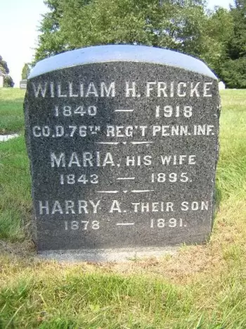 FRICKE, WILLIAM HENRY (1840-1918). Corporal, 76th Pennsylvania Infantry, Company D; private, 196th Pennsylvania Infantry, Company H. Of German birth, Fricke immigrated to the United States when he was nineteen. During the Civil War, he enlisted as a private on July 14, 1864, mustered into the 196th Pennsylvania the same day, and mustered out after 100 days on November 17, 1864, at Philadelphia, Pennsylvania. On February 18, 1865, he re-enlisted as a private, mustered into the 76th Pennsylvania, and was promoted to corporal on July 1 shortly before he mustered out on July 18, 1865, at Raleigh, North Carolina.