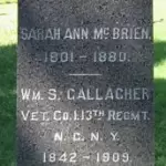 GAHAN, JOHN (1841-1877). Corporal, 155th New York Infantry, Company A. Enlisting as a corporal on August 12, 1862, at New York City, his birthplace, Gahan mustered into the 155th New York on November 18 of that year. He was wounded on June 3, 1864, at Cold Harbor, Virginia. At some point in his service, he was reduced in rank to private. On July 7, 1865, he mustered out at Washington, D.C. His application for an invalid pension was granted in 1875, certificate 123,645. He last resided at 181 Sackett Street in Brooklyn. His wife, Caroline, who is interred with him, applied for and received a widow’s pension in 1890, certificate 313,736. Section 177, lot 13705.