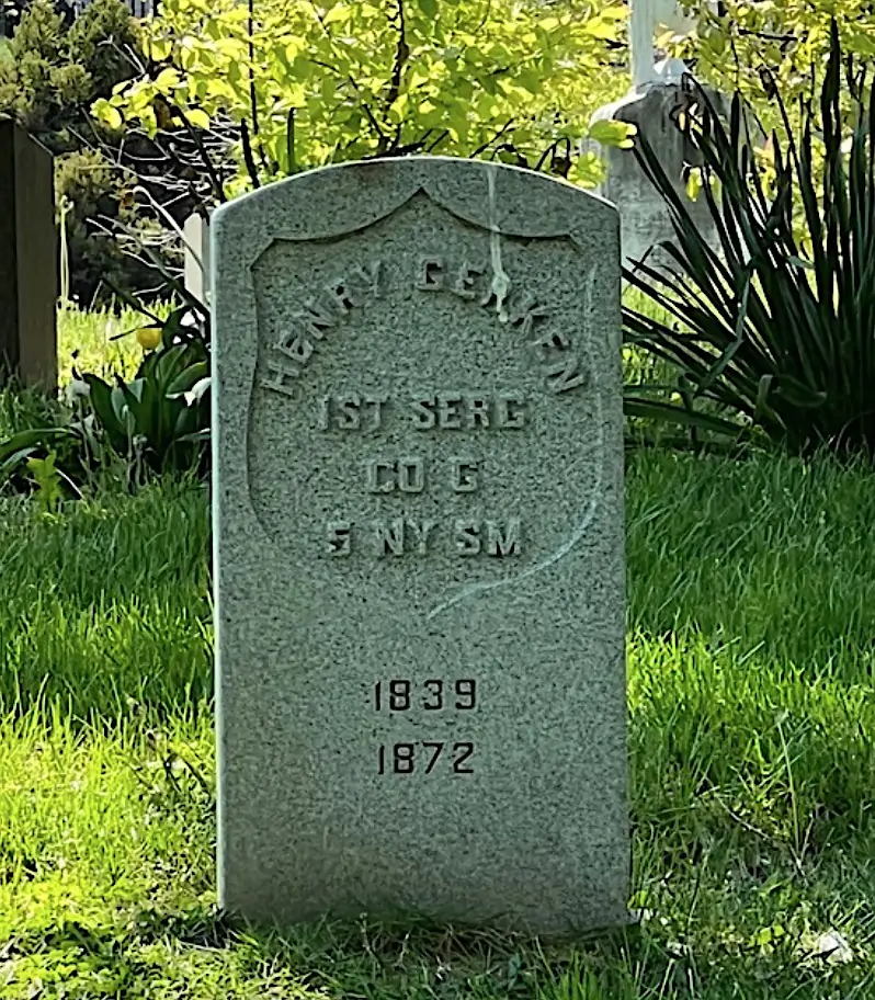 GERKEN, HENRY (1839-1872). First sergeant, 5th Regiment, New York State Militia, Company G. Born in Germany, Gerken enlisted as a first sergeant on May 16, 1861, at Washington, D.C., and mustered that day into Company G of the 5th Regiment, known familiarly as the Jefferson Guard. He mustered out after three months on August 7 at New York City. His last residence was 136 North Oxford Street in Brooklyn. Section 14, lot 6737.