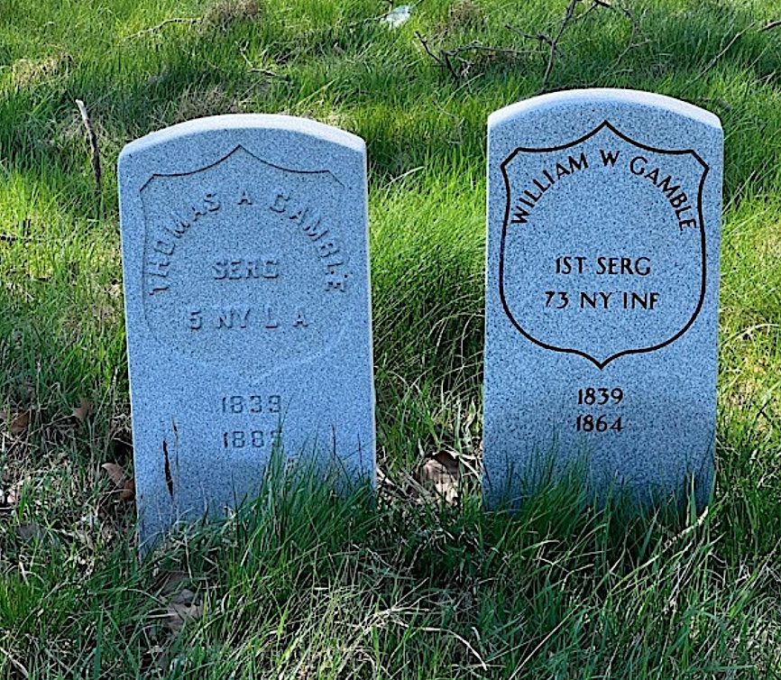 GAMBLE, WILLIAM W. (1841-1864). First sergeant, 73rd New York Infantry, Companies E and F. Born in New York and a resident of 163 West 33rd Street in Manhattan, he enlisted as a private on August 12, 1861, at Camp Decker, New York, and mustered into Company E of the 133rd New York two days later. Upon his promotion to corporal on September 1, he was transferred into Company F that day. He rose to sergeant on July 1, 1862, and to first sergeant on July 1, 1864. Gamble was killed in action on September 16, 1864, at the Battle of Petersburg, Virginia. Most likely, he was a relative of Thomas Gamble (see). Section B, lot 8100, grave 60.