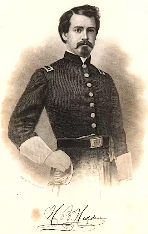 In his death we have lost an esteemed friend, a gallant soldier and a brilliant social companion. While far in advance of the army, attached to a small command for the purpose of ascertaining the location and strength of the enemy, he was called upon to perform extraordinary services and to undergo unusual hardships. He shrank from no emergency, but was only too anxious to be placed where the danger was greatest. When finally brought face to face with an opposing force far superior to his as regards numbers, he did not hesitate a moment, but at the head of fourteen men charged upon one hundred and fifty well-armed infantry, driving them from the field, capturing thirteen prisoners, and utterly dispersing the entire force while cutting his way to the officer commanding the enemy. His brilliant career was ended forever by a single shot which killed him instantly. In the language of his commanding officer, “Lieutenant Hidden has illustrated, in the sacrifice of his life, the whole cavalry service. He has introduced for it a new era.”