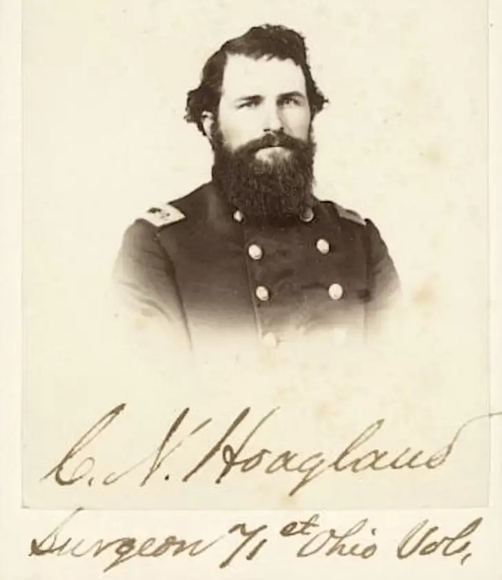 At the onset of the Civil War, Hoagland enlisted as a second lieutenant on April 22, 1861, was promoted to first lieutenant two days later, and was commissioned into Company H of the 11th Ohio, known as the Lafayette Blues, on April 26, 1861. He was subsequently discharged for promotion on June 17, 1861. On October 28, 1861, he enlisted as a surgeon and mustered into the 71st Ohio Infantry on that date. The regiment, part of the Army of the Tennessee, was first sent to Paducah, Kentucky, then participated in the Battle of Shiloh in Tennessee (also known as the Battle of Pittsburg Landing) in April 1862. He then was detached to Clarksville, Tennessee, and later to Gallatin, Tennessee, where his health suffered. After resigning on September 7, 1863, and restoring his health, he mustered in again on November 11, 1863, and was appointed chief surgeon of the Second Brigade in 1864. At the time of the latter appointment, the Second Brigade, in the Atlanta Campaign, was at the front in Atlanta, Georgia. Hoagland was seriously wounded at the Battle of Nashville, Tennessee, on December 16, 1864, by a Minie-ball shot to the breast. The Second Brigade then wintered at Huntsville, Alabama, before returning to East Tennessee in the spring of 1865. Hoagland mustered out on November 30, 1865. At the time of muster out, the troops were ordered to Columbus, Ohio, where the official discharge took place the first week of January 1866. During his service, he was frequently in charge of major field hospitals.