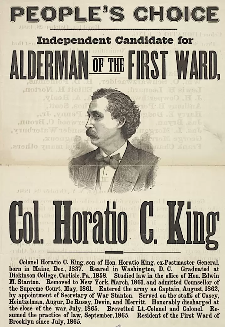 KING, HORATIO COLLINS (1837-1918). Medal of Honor recipient; colonel, lieutenant colonel and major by brevet; major and quartermaster, United States Volunteers. Born in Portland, Maine, King’s father was the Postmaster General of the United States under President Buchanan. He grew up in Washington, D.C., and was an 1858 graduate of Dickinson College in Carlisle, Pennsylvania, where his uncle Charles Collins was its president. He studied law in the office of Edwin M. Stanton (Secretary of War in the Lincoln administration), was admitted to the bar in 1861, but shortly thereafter went off to fight in the Civil War, enlisting at Brooklyn as a captain on August 19, 1862, and being commissioned into the United States Army’s Quartermaster’s Department that day. He served in the Army of the Potomac and the Army of the Shenandoah, headed the commissary department of the Army of the Potomac 1864-65 as major and quartermaster of the United States Volunteers, and was brevetted major, lieutenant colonel and colonel in 1865. His brevet to colonel cited his gallantry at the Battle of Five Forks, Virginia.
