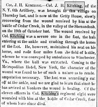 Before the Confederates reached Kitching’s men, who then numbered about 1,000, they too, began to retreat. At that time, Kitching, desperately trying to rally the troops, was severely wounded in the ankle by a Minie ball. He continued to urge his men to stand and fight, though many urged him to leave the field to have his ankle treated. It was only after Major General Sheridan arrived at the battle, and dramatically rallied his army, that Kitching agreed to seek treatment. This report in the Yonkers Statesman, published on December 8, 1864, describes Kitching’s mortal wound: