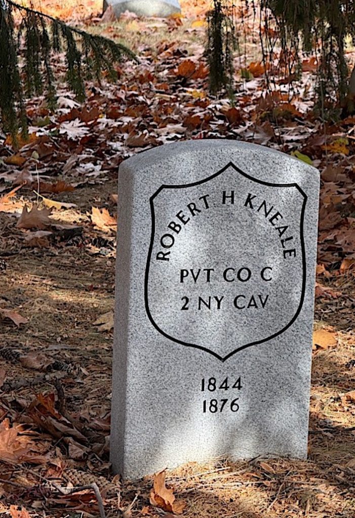 KNEALE (or KNEAL, KNEEL), ROBERT (or JOHN) H. (1844-1876). Private, 2nd New York Cavalry, Companies A and C. Born on the Isle of Man, Kneale enlisted at New York City as a private on August 19, 1862, and mustered into Company A of the 2nd New York Cavalry the same day. Also borne on the rolls as John Kneel, he was captured as a prisoner of war at New Baltimore, Virginia, on October 19, 1863, and on March 15, 1864. He was paroled on March 21, 1864, at City Point, Virginia, and on March 28, 1864, at Richmond, Virginia. On August 29, 1864, he was transferred into Company C where he served until he mustered out on June 17, 1865, at Annapolis, Maryland. He last lived at 780 Greenwich Street in Manhattan. He died of heart disease. Section 147, lot 21873.