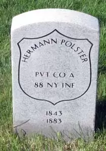 POLSTER (or POLESTER), HERMANN (or HERMAN) (1843-1883). Private, 88th New York Infantry, Companies B and A. A native of New York City, he enlisted there on September 12, 1861, and mustered into the 88th eight days later. He was transferred into Company A on June 12, 1863, re-enlisted on December 31 of that year, and deserted on February 13, 1864, at the expiration of his furlough. He died from phthisis in Brooklyn at a rest-home. Section 17, lot 17245, grave 415.