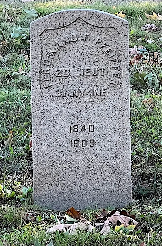 PFEIFFER, FERDINAND F. (1840-1909). Second lieutenant, 31st New York Infantry, Company H; private, 71st Regiment, New York State National Guard, Company A. Born in New York City, Pfeiffer enlisted as a second lieutenant there on May 21, 1861, was commissioned into the 31st New York four days later, received an official promotion to second lieutenant on July 4, and resigned his commission on August 10 of that year. On May 28, 1862, he re-enlisted as a private at New York City, mustered into the 71st New York, and mustered out at New York City after serving three months on September 21. In 1907, he applied for and was granted an invalid pension, certificate 1,135,174. His last residence was on West 131st Street in Manhattan. He died from cancer. Section 118, lot 5322, graves 9 and 10.
