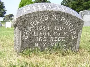 PHILIPS, CHARLES S. (1844-1907). Second lieutenant, 169th New York Infantry, Companies C and B. After he enlisted as a corporal at Brunswick, New York, on September 6, 1862, Philips mustered into Company C of the 169th a month later on October 6. He rose to sergeant and first sergeant on unstated dates, to second lieutenant on April 1, 1865, and transferred to Company B four days after his last promotion. On July 19, 1865, he mustered out at Raleigh, North Carolina. His application for an invalid pension was granted in 1869, certificate 105,696.