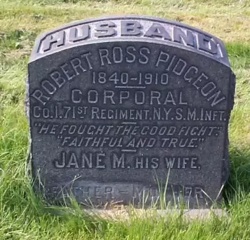 PIDGEON, ROBERT R. (1840-1910). Corporal, 71st Regiment, New York State National Guard, Company I. After enlisting at New York City and mustering into the 71st as a corporal on May 28, 1862, he mustered out after three months on September 2 at New York City. He died of heart disease. His tombstone bears the inscription, “He fought the good fight. Faithful and true.” Section 2, lot 5499.
