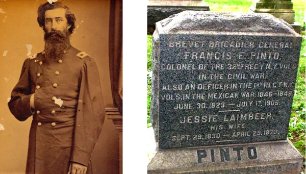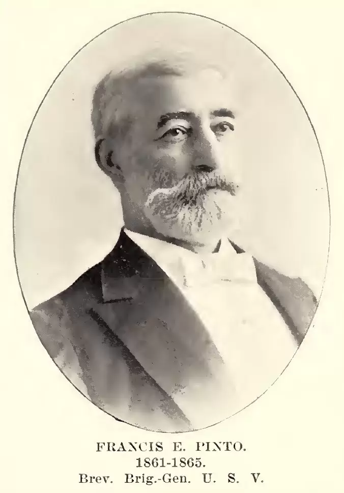PINTO, FRANCIS EFFINGHAM (1823-1905). Brigadier general by brevet; colonel, 31st New York Infantry; 32nd New York Infantry. Born in New Haven, Connecticut, he served with the 1st New York during the Mexican War engaging in the Battles of Vera Cruz, Cerro Gordo and Chapultepec. Pinto, a clerk, was 5′ 9″ with blue eyes and dark hair. At age 35, he enlisted at New York City on May 22, 1861, and was commissioned into the 32nd New York nine days later as its lieutenant colonel. On December 2, 1861, Brigadier General John Newton, United States Army, in his field report from Annandale, Virginia, commended Pinto for “…great coolness, decision, and prudence” in an emergency situation when he led a company from his pickets to support men who had been engaged in a skirmish at Fairfax Courthouse, Virginia.