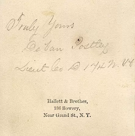 A widower, Postley married Alice Castle on December 12, 1864. The 1870 census reports that Postley lived in Manhattan. Apparently, he deserted his wife and their two young children after about six years together. For a few months after his desertion, he called occasionally to see his children but then never came again. According to the 1886 New York City Directory, he was a lawyer. The Veterans Census of 1890 confirms his service in the Civil War and indicates that he lived in New York City. In 1903, his application for a pension was approved, certificate 1,066,804. He is buried with his nephew, De Van Postley (see). He last lived on West 22nd Street in Manhattan.