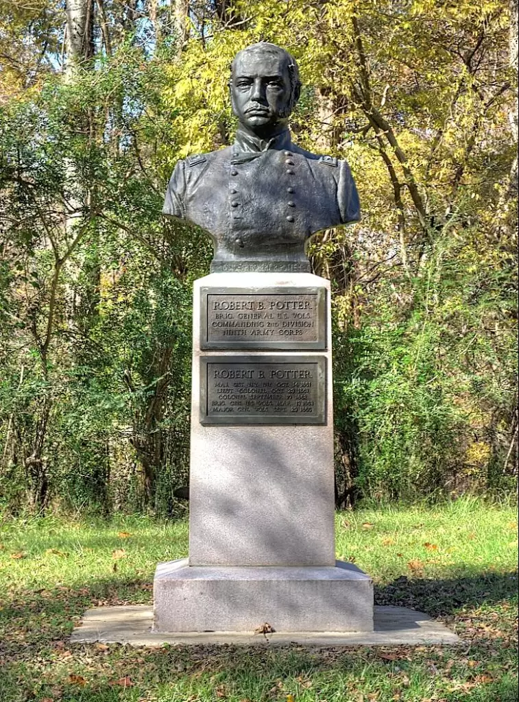 POTTER, ROBERT BROWN (1829-1887). Major general by brevet; major general, United States Volunteers, Division 2, 9th Corps; colonel, 51st New York Infantry. Initially interred at Green-Wood, his remains were removed on November 3, 1894. Born in Schenectady, New York, his father was an Episcopal bishop and his grandfather was the president of Union College. Potter attended that institution but left to pursue a career in law. His first commission was in the 51st New York, known informally as “Shepard’s Rifles.” He was promoted to major of that regiment on October 14, 1861, and rose to lieutenant colonel on November 1, 1861. Brigadier General Jesse L. Reno, United States Army, in his field report from New Berne, North Carolina, on March 16, 1862, wrote that Potter, “…was wounded early in the action, but he most gallantly continued with the regiment during the entire battle and rendered very important service…” Edward Ferrero (see), the colonel of the 51st New York, singled him out in his report the next day for his “great gallantry and coolness.”