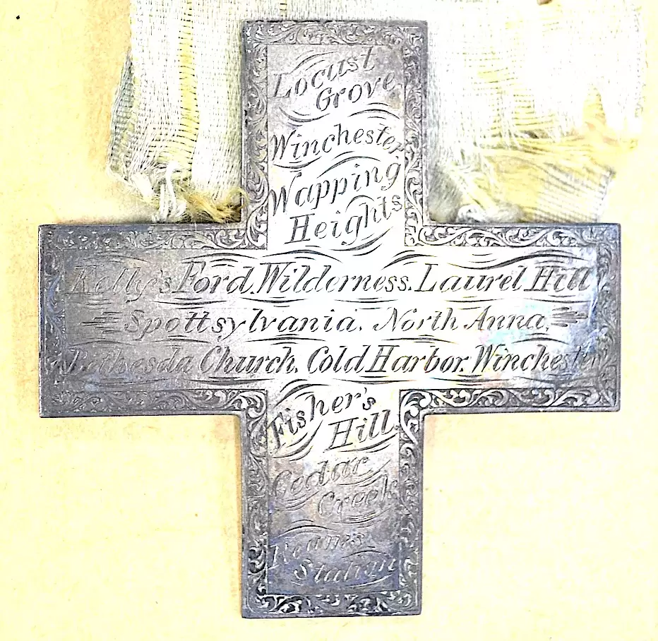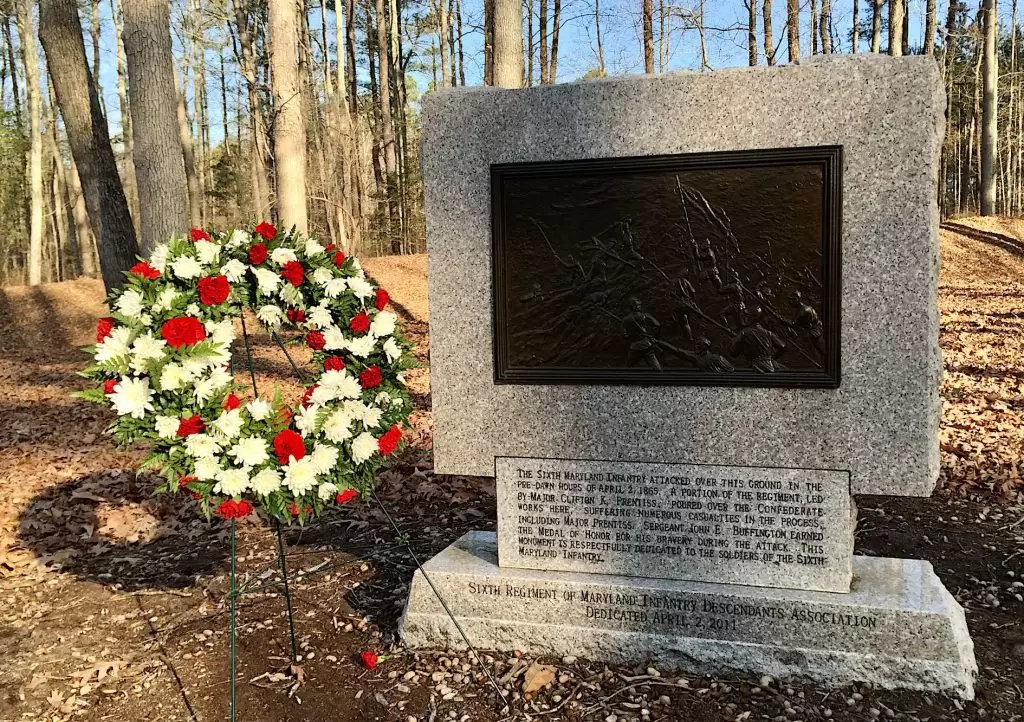 Prentiss commanded the 6th Maryland at Opequan, Cedar Creek, and Petersburg. According to the report of the field correspondent for the New York Herald, during the Union advance on the Petersburg earthworks on April 2, 1865, Prentiss was the first officer to enter the enemy works. This claim is supported by General J. Warren Keifer, the brigade commander who, in his official report on April 14, stated: “Maj. Prentiss with a large portion of the 6th Md., was the first to penetrate the enemy works. After a most bloody struggle he fell mortally wounded very soon after entering the fortification. Too much praise cannot be given to the officers and men of this regiment.” John R. King, who wrote Sixth Corps at Petersburg- Its Splendid Assault, Which Broke the Main Line of the Rebels, in the April 15, 1920 National Tribune, gave this account, “A Pathetic Incident”: “Maj. Clifton K. Prentiss, a Baltimorean, was a man of exceptional bravery, a veritable cavalier. On this fateful morning he fell mortally wounded, as with waving sword he urged forward his men, to be the first to mount, with assistance, the enemy’s works.” Records indicate that he had suffered a gunshot wound to his left lung. Lieutenant Colonel Joseph Hill of the 6th Maryland singled out Prentiss for bravery in his field report of April 16, 1865, and concluded, “The Sixth Regiment Maryland Volunteers on that occasion acquitted herself with honor to her command, honor to her State and to her country at large…”
