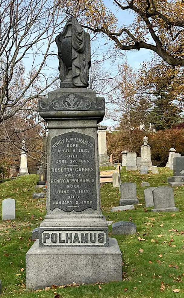 The 1875-1876 New York City Directory lists Polhamus as a merchant at 140 Front Street with a home in New Rochelle, New York; the 1877 New York City Directory indicates that the 140 Front Street business was in oils. His last residence was in New Rochelle, New York. In his obituary, veterans from his company in the 7th Regiment were requested to attend his funeral and were given a train schedule from Grand Central Station. Section 80, lot 2954.