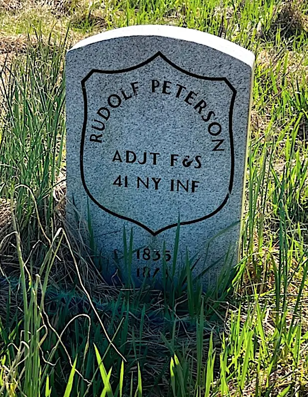 PETERSON, RUDOLF (or RUDOLPH) (1835-1873). Adjutant, 41st New York Infantry. Originally from Germany, he enlisted on June 6, 1861, at New York City, as a sergeant major, and was commissioned into the Field and Staff of the 41st on the same day. Peterson was promoted to second lieutenant on July 30, 1861, and to adjutant on September 1, 1861. He last lived at 405 East 29th Street in Manhattan. His death was caused by typhlitis, an intestinal disease. Section 17, lot 17245, grave 1059.