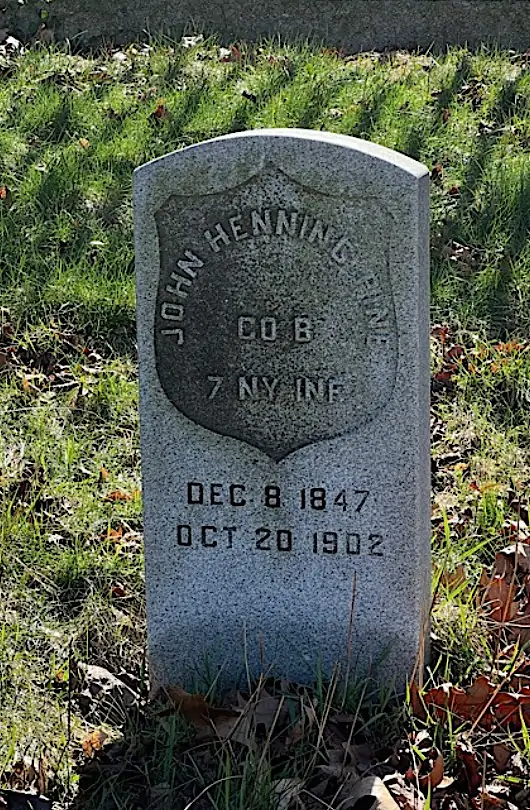 PINE, JOHN HENNING (1847-1902). Private, 7th New York Veteran Infantry, Company B. A native of New York City, Pine enlisted there as a private on March 22, 1865, and mustered in the same day. His enlistment papers note that he signed up for one year, agreed to accept bounty, pay and clothing established by law for volunteers, and swore his allegiance to the United States of America,“…I will serve them honestly and faithfully against all their enemies or opposers whomsoever….”As per his muster roll, he was a clerk who was 5′ 6″ tall with brown eyes, brown hair and a light complexion. The 7th Veterans fought in the Appomattox campaign in Virginia in 1865. The muster roll notes that he was absent and sick on June 30, 1865. He was admitted to Armory Square Hospital at Washington, D.C., on June 2 and was discharged from the hospital on July 3, 1865. Armory Square Hospital was noteworthy because it was built in 1862 as a model hospital according to the guidelines of the United States Sanitary Commission. In addition, that facility recorded the largest number of soldier deaths of any Washington military hospital. His papers at muster out indicate that he was paid a bounty of $33.33, and had settled his clothing account.