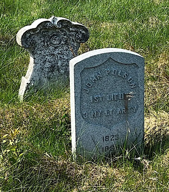 POLSON, JOHN (1823-1868). First lieutenant, 3rd New York Light Artillery, Battery B. Originally from Ireland, Polson enlisted on April 29, 1861, at Elmira, New York, as a first lieutenant. On May 22, 1861, he was commissioned into Battery B of the 3rd New York Light Artillery serving there until he resigned on January 24, 1862. His last residence was 202 East 42nd Street in Manhattan. His death was caused by empyema, a lung condition. Section B, lot 8100, grave 611.