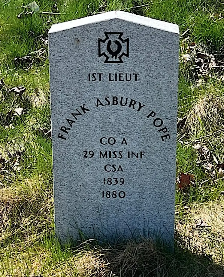 POPE, FRANK (or FRANCIS) ASBURY (1839-1880). First lieutenant, 29th Mississippi Infantry, Company A, Confederate States of America. A Mississippi native, Pope graduated from the University of Mississippi, class of 1861, where he was a member of the Delta Psi fraternity. He was 6′ 1″ tall with gray eyes, dark hair and complexion. On March 15, 1862, he enlisted as a second lieutenant at Lexington, Mississippi, (the county seat of Holmes County), and mustered into the 29th Mississippi. Pope was promoted to first lieutenant on May 17, 1862, and was slightly wounded on the left side during an engagement at Munfordville, Kentucky, on September 19 of that year. Listed as absent on the muster rolls for March and April 1863, he was on conscription duty at that time. He was captured at the Battle of Lookout Mountain at Chattanooga, Tennessee, on November 24, 1863, and was held as a prisoner of war at Johnson’s Island, Ohio, as of December 1, remaining there until he took the oath of allegiance to the United States on June 13, 1865, and was released.