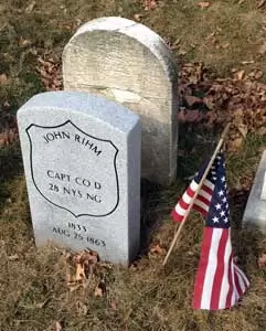 RIHM, JOHN (1833-1863). Captain, 28th Regiment, New York State Militia, Company D. A native of Germany, he enlisted as a first sergeant at Brooklyn on April 23, 1861, mustered into the 28th Regiment the next month on May 11, was promoted to captain on June 20, and mustered out at Brooklyn after three months on August 5. He returned to service on June 13, 1863, was commissioned into the same unit and company (then part of the National Guard) on that date, and mustered out after 30 days on July 22 at Brooklyn. He died a month later on August 25, 1863, of peritonitis. His last residence was on Atlantic Street in Brooklyn. A marble Veterans Administration stone was ordered for him early in the 20th century. Section 115, lot 13536 (Soldiers’ Lot), grave 17.