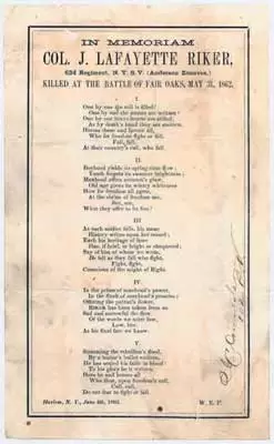 After rejoining the regiment, Riker led his troops in Virginia at Fortress Monroe and at Williamsburg. He was killed at the Battle of Fair Oaks in Virginia on May 31, 1862. Mortally wounded, his last words were, “Boys, we’re surrounded-give them some cold steel.” His aide, Lieutenant Bradley, described Colonel Riker’s action in the encounter as magnificent, “the coolness of the colonel, in the most trying situations, being absolutely marvelous.” On June 5, 1862, Lieutenant Colonel David J. Nevin, 62nd New York, cited Riker’s valor when he wrote from the battlefield that the regiment was fired upon once the Confederates saw their colors, “Shortly after forming in line Col[onel] J[ohn] Lafayette Riker was killed while gallantly cheering on his men to save the battery, which was threatened at the time by the enemy. In Colonel Riker’s death we have sustained a heavy loss, as he was a gallant and brave officer.” Brigadier General Erasmus Keyes, United States Army, eulogized him in his field report of June 13, 1862, “The losses in the Sixty-second were not so great as in some of the other regiments; its conduct was good, and its colonel, J. Lafayette Riker, whose signal bravery was remarked, met a glorious death while attacking the enemy at the head of his regiment…”