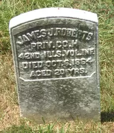 ROBERTS, JAMES J. (1844-1864). Private, 42nd Illinois Infantry, Company H. A resident of Canton, Illinois, he enlisted and mustered in on August 10, 1861. He was discharged for a disability at Jefferson Barracks, Missouri, on an unstated date. Section 117, lot 10975, grave 61.