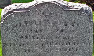 RICHARDS, CHARLES H. (1837-1883). Captain, 13th Virginia Infantry, Company C, Confederate States of America. Born in Virginia, Richards was 6′ 1″ tall with a dark complexion, dark eyes and “mixed hair” when he enlisted at Gordonsville, Virginia, as a lieutenant, on April 17, 1861, the same day that he was commissioned into Company C of the 13th Virginia. On July 1, 1861, he was promoted to second lieutenant and became first lieutenant on April 23, 1862. He was promoted to captain on May 15, 1863, and was posted to acting commander of his unit on September 29, 1864. On October 19, 1864, he was wounded by a round ball in the left thigh at the Battle of Cedar Creek, Virginia, taken as a prisoner of war two days later, and confined at Fort McHenry, Maryland. On October 24, 1864, he was moved to Fort Delaware, Delaware. The muster roll for December 1864 notes that he was released from the U.S. General Hospital (West Building’s Baltimore Hospital) on December 9, 1864, and returned to Fort Delaware where he remained incarcerated until he took the oath of allegiance on June 17, 1865, at which time he was released. His last address was in Brooklyn. He died while in St. Peter’s Hospital using the name of Richard Richardson. Section 81, lot 5615.