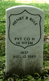 RULE, HENRY B. (1827-1889). Private, 84th New York (14th Brooklyn) Infantry, Company H. Born in Scotland, Rule enlisted as a private at Brooklyn on August 22, 1862, and mustered into the 14th the next day. Wounded in action at the Battle of Antietam, Maryland, on September 17, 1862, he was discharged for disability on December 22 of that year at Fairfax Seminary, Virginia. According to the 1880 census, he was working as a baker. He last lived at 128 Carlton Avenue in Brooklyn. He died of valvular disease of the heart. Section 2, lot 8445.
