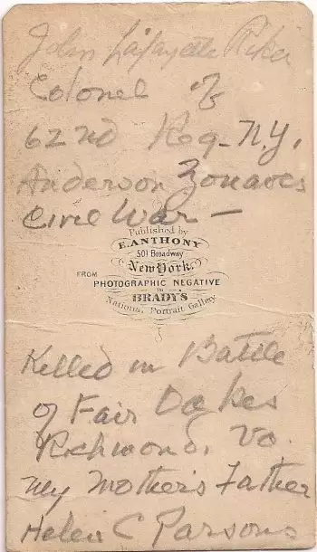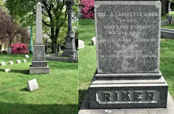 RIKER, JOHN LAFAYETTE (1824-1862). Colonel, 62nd New York Infantry. Born in Manhattan, his father was a merchant and New York City alderman. His maternal grandfather, John Van Arsdale, served with General Lafayette during the American Revolution. When Lafayette returned to visit the United States in 1824, throngs of Americans came to meet him at the Battery in New York City, among them John Van Arsdale, who was so pleased when he was recognized by the renowned French hero. Van Arsdales’s daughter, Elizabeth, had given birth to a son the day before (August 15), and he asked her to give his grandson the middle name “Lafayette.” John Lafayette Riker’s wife, Ann Eliza Elder Riker (who is buried in Section 57, lot 2340), died in 1851 and their son, John Lafayette, Jr., died in 1854, leaving him with a teenage daughter, Anna, when the Civil War began.