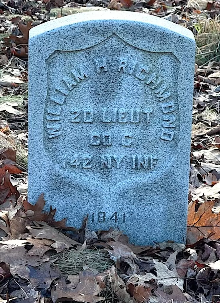 RICHMOND, WILLIAM H. (1841-1872). Second lieutenant, 142nd New York Infantry, Company C. After Richmond enlisted as a corporal on August 13, 1862, at Waddington, New York, he mustered into the 142nd New York on September 29. He was promoted to sergeant on April 15, 1863, to second lieutenant on March 18, 1865, and mustered out at Raleigh, North Carolina, on June 7, 1865. His last residence was 59 Quincy Street in Brooklyn, New York. Consumption was the cause of his death. Section 59, lot 1474, grave 10.