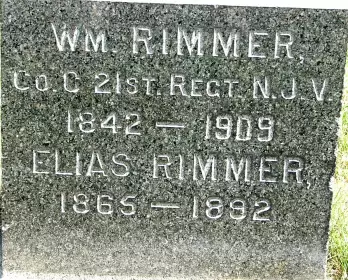RIMMER, WILLIAM (1842-1909). First lieutenant, 4th New York Heavy Artillery, Company F; private, 21st New Jersey Infantry, Company C. Of English birth, he enlisted as a first lieutenant at New York City, mustered into the 4th New York Heavy Artillery on January 29, 1862, and resigned on June 17 of that year. He re-enlisted as a private on August 28, 1862, mustered into the 21st New Jersey on September 15, and mustered out at Trenton, New Jersey, on June 19, 1863. He last resided at 259 80th Street in Brooklyn. He died of pneumonia. Section 135, lot 27263, grave 1891.
