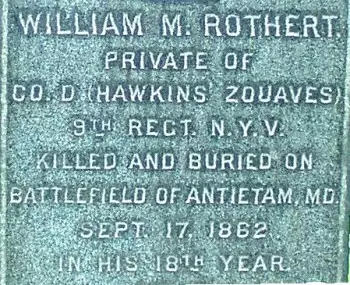 ROTHERT, WILLIAM (1841-1862). Private, 9th New York Infantry, Company D. Rothert is not buried at Green-Wood; the cenotaph to him at the cemetery honors his memory. Rothert was born in New York City. His birth year is unclear based on his cenotaph which differs from census records and the final soldier papers. The 1850 census indicates that he was living in New York City with his parents and younger sister; William was attending school. As per the 1855 New York State census, 10-year-old William was living in New York City with his parents, three younger sisters and two boarders.
