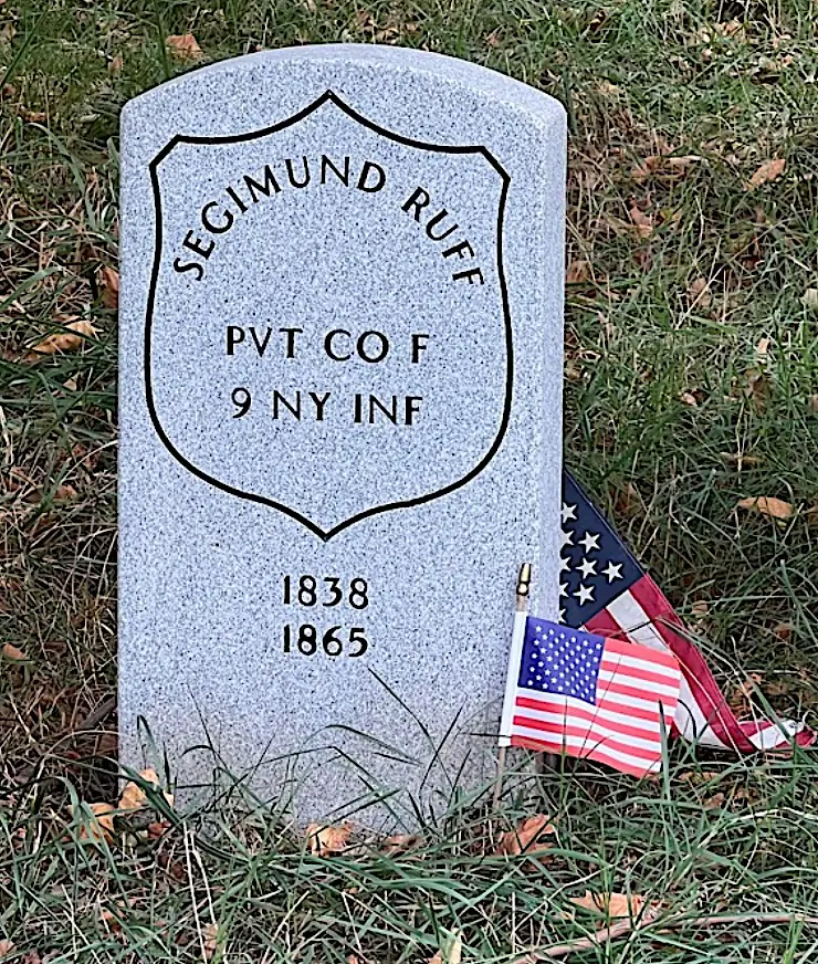 RUFF, SEGIMUND (or SIGMUND, SEGISMUND) (1838-1865). Private. 9th New York Infantry, Company F. Of German origin, he enlisted as a private on April 23, 1861, at New York City, mustered into the 9th on May 4, and mustered out on May 20, 1863, at New York City. His last residence was 142 3rd Avenue, Manhattan. Section 115, lot 8999, grave 341.