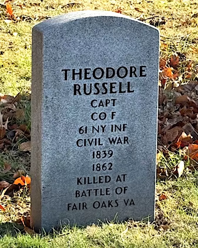RUSSELL, THEODORE (1839-1862). Captain, 61st New York Infantry, Company F; private, 7th Regiment, New York State Militia, Company A. A resident of 130 West 34th Street in Manhattan, he enlisted in the 7th for its 1861 activation, which lasted from April 18, 1861, to June 3, 1861. He re-enlisted at New York City as a captain on October 1, 1861, and was commissioned into the 61st New York three days later. The 61st was part of the Army of the Potomac and took part in the Peninsula Campaign. Russell was killed in battle on June 1, 1862, at Fair Oaks, Virginia. Colonel Francis C. Barlow, commanding officer of the 61st, wrote the next day in his field report from Fair Oaks Station, Virginia, that Russell (and other officers) did not shrink or fail in confronting the enemy and were “shot dead while doing their duty firmly, calmly, and nobly…” Interment at Green-Wood was on June 15, 1862. Section 21, lot 8870.