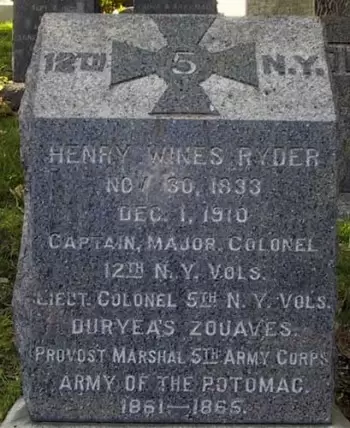 RYDER, HENRY WINES (1833-1910). Lieutenant colonel, 5th New York Veteran Infantry; captain, 12th Regiment, New York State Militia, Company E. In 1861, Henry W. Ryder was captain of Company E, 12th New York State Militia when it was activated for three months, from May 2 until August 5, 1861. A year later, he was wounded in the head at the Battle of Second Bull Run, Virginia. He was acting aide-de-camp for Brigadier General Daniel Butterfield, and then was appointed Provost Marshal of the 5th Army Corps in 1863. Ryder was promoted to major in 1864, and then became major of the 5th New York Veteran Infantry. He was promoted to lieutenant colonel and then colonel the same year, but both appointments were declined. In April 1865, he did become lieutenant colonel of the 5th New York Veterans, and he mustered out at Hart’s Island, New York Harbor, on August 21, 1865. He last lived in Newark, New Jersey where he died of pneumonia. Section 119, lot 9102.