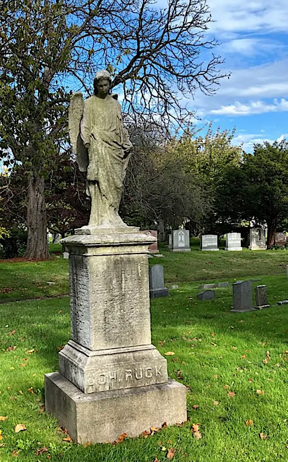 RUCK, JOHN (1829-1904). First sergeant, 42nd New York Infantry, Company B. Of German birth, he enlisted at Great Neck, New York, as a first sergeant on June 22, 1861, mustered into the 42nd on that day, and deserted at some point. He may also have served as a first lieutenant in the 73rd New York Infantry, Companies D and I. Ruck last resided on West 69th Street in Manhattan. He died of cardiac disease. Section 114, lot 17124.