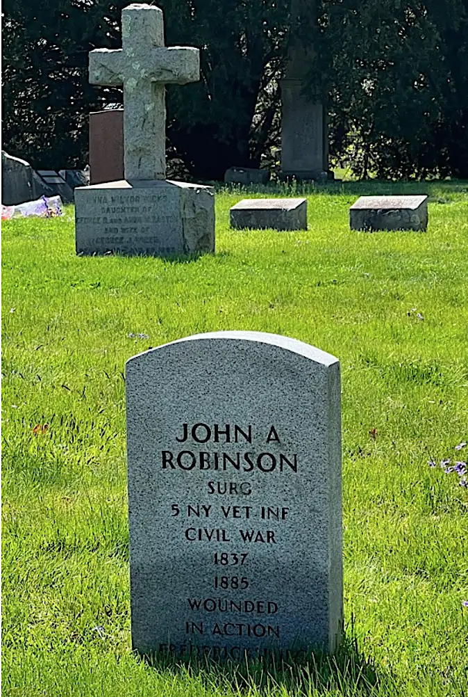 ROBINSON, JOHN A. (1837-1885). Surgeon, 5th New York Veteran Infantry; assistant surgeon, 38th New York Infantry; 162nd New York Infantry. Born in Dublin, Ireland, he enlisted on September 15, 1862, at Washington, D.C., and was commissioned into the 38th New York on that date. He was wounded in the right shin by the plug from a Hotchkiss shell on December 13, 1862, at Fredericksburg, Virginia, and mustered out on June 22, 1863, at East New York. Re-enlisting and commissioning in on August 27, 1864, at Harpers Ferry, West Virginia, Robinson served in the 162nd New York until he mustered out on October 10, 1864. He was then commissioned into the 5th New York as a surgeon on October 23, 1864, after enlisting that day at Weldon Railroad, Virginia, and mustered out on August 21, 1865, at Hart’s Island, New York Harbor. His application for an invalid pension was granted in 1883, certificate 369,025. He last resided in Brooklyn. His death was caused by heart disease. In 1885, Lucetta A. Robinson applied for and received a widow’s pension, certificate 235,613. Section 76, lot 2575.